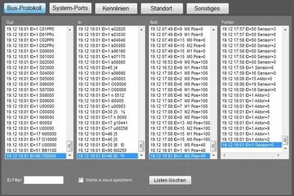 Hier wird die Komunikation zwischen PC und Controllern aufgezeichnet. Wenn ein bestimmter Controller beobachtet werden soll, kann unter ID-Filter die entsprechende Nummer eingegeben werden.