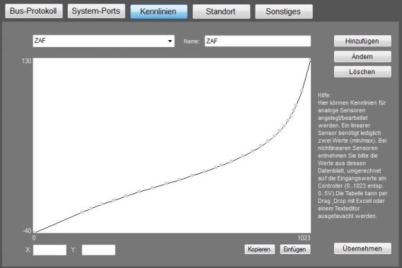 Für die analogen Eingänge der StepperMatic-Controller kann hier eine Kennlinie eingegeben werden. Für lineare Sensoren reicht eine Kennlinie mit zwei Werten, bei nichtlinearen Sensoren entnehmen Sie bitte so viele Daten wie möglich aus dem Datenblatt des Sensors. Sie können die Kennlinie per Drag & Drop mit Excel oder einem Texteditor bearbeiten.