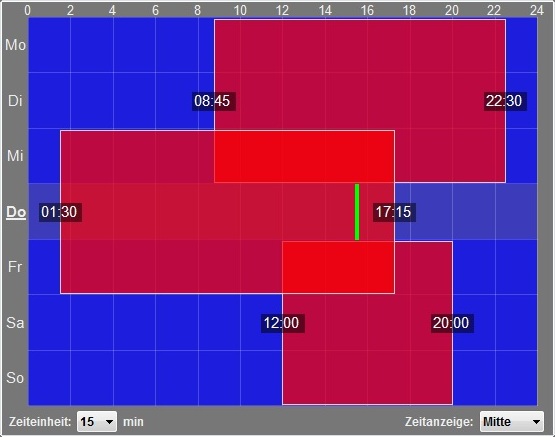 Die roten Flächen stellen aktive Zeitblöcke, den Tag-Betrieb dar, der Rest bedeutet Nacht-Betrieb.